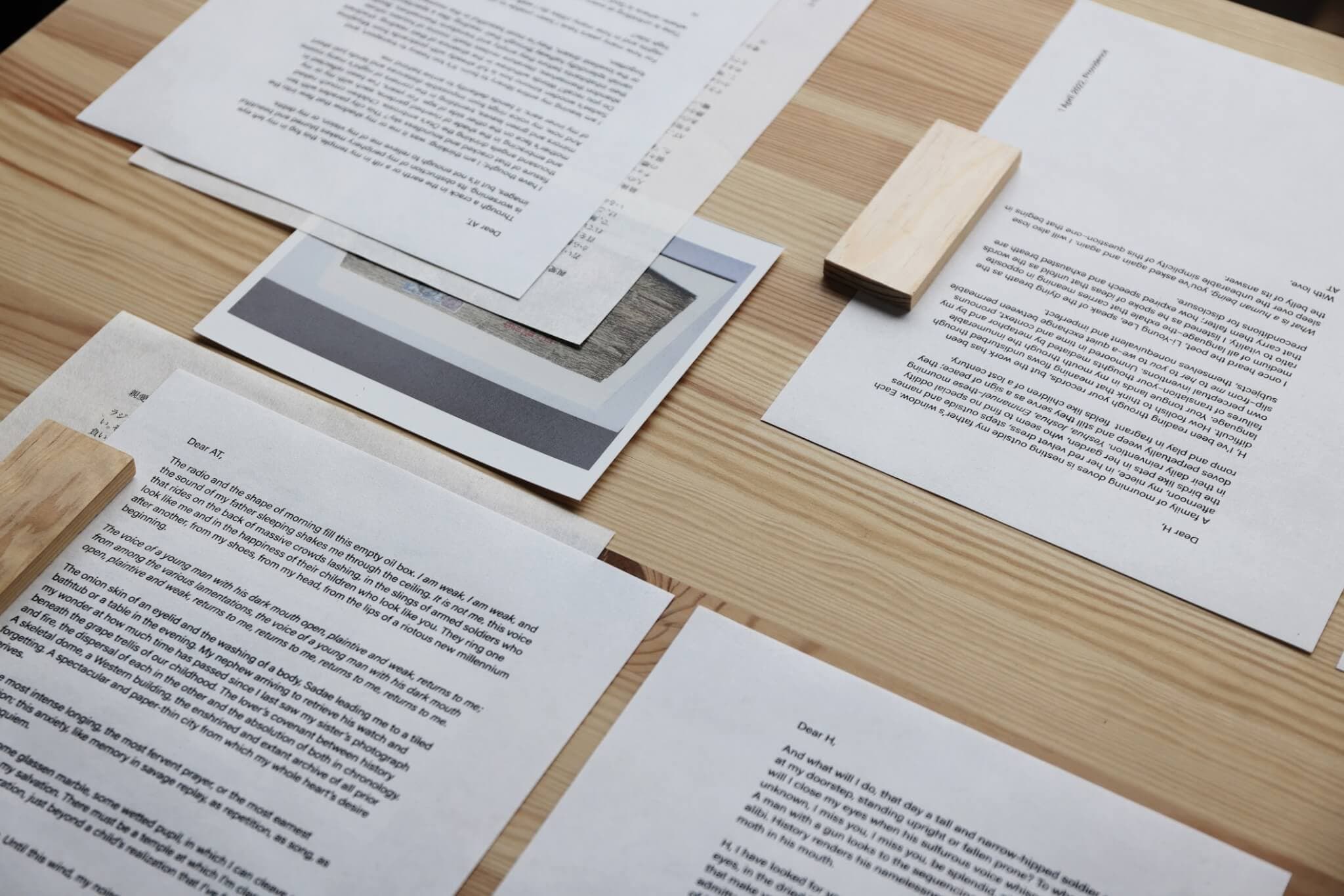 On two tables, the thirteen letters, titled Letters to/from H, are set like placemats. Each piece is dated on the side, stretching throughout the year 2022, and identified by a location, either Providence or Tokyo. Next to or beneath several letters are pictures of some of Hara’s letters and possessions that currently reside in the Hiroshima City Chuo Library. The language in the fictive texts on display follows themes of the temporal, gesturing toward the “fractured,” “fragmented,” and “eternal.” “Minutes stretch onward,” a letter from H reads, “as if mocking infinity and the ability to measure them escapes me.” At other times, Tsubota and Hara both look back to their youth: “After forty years, I still see my boyhood in these waters,” writes Hara of the Ōta river. Each piece sparks rumination, particularly around the mechanisms of history. Hara wonders how his writing will be perceived as he records it, asking, “How will historians describe this dream?” Tsubota reminds the reader how time can be so important to someone, only to have their name later erased in history.