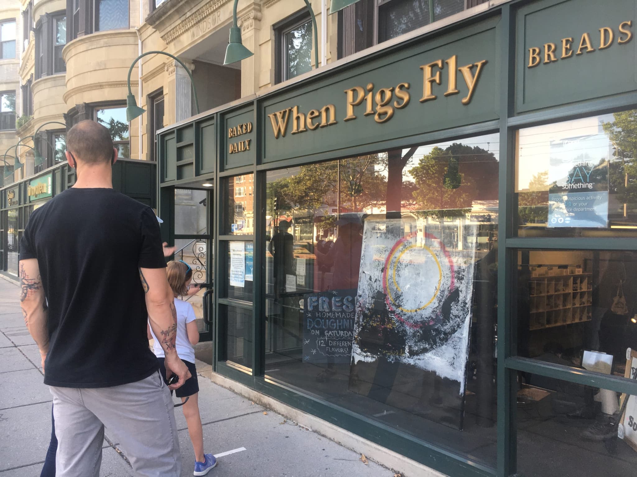 Artist Nathan Heilman in front of hafvilla : co p p er fl avor ed co ffe, 2020, installed at When Pigs Fly in Coolidge Corner.