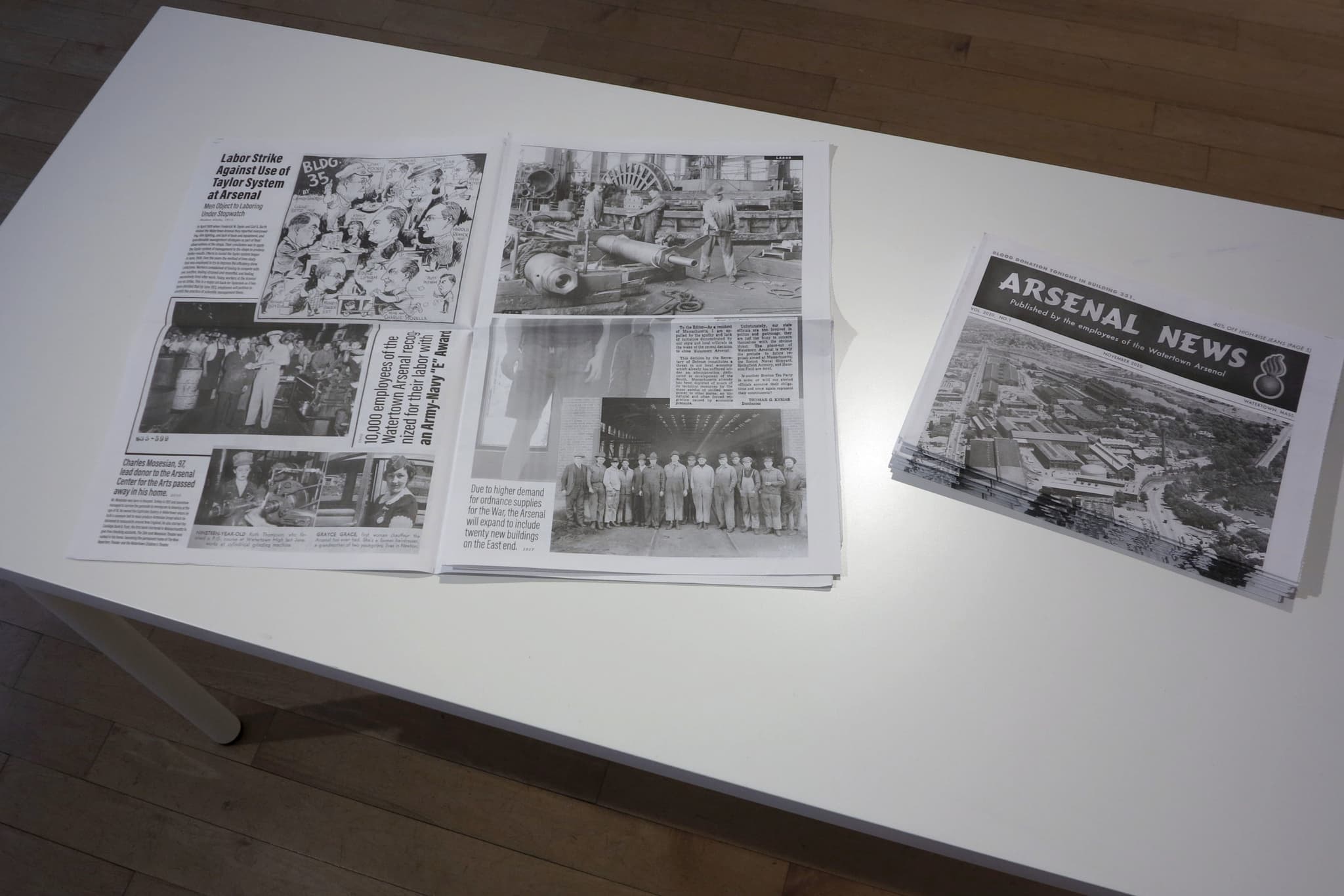 In the main gallery, copies of Arsenal News are available for visitors to take home. This newspaper, which is also available around Watertown Arsenal Yards, is Zakari’s reimagining of a now-defunct biweekly publication for the Arsenal workers. The artist’s version is not a summary of the exhibition, but within its twelve pages, she has curated a perspective that focuses on the people and their labor, tracing this thread through to the present day. The work is a pastiche of past and present, using historic and contemporary photos and clippings of people and events from the Arsenal’s history. Like the video installation, the two interrupt each other, and the line between which informs the other is blurred.