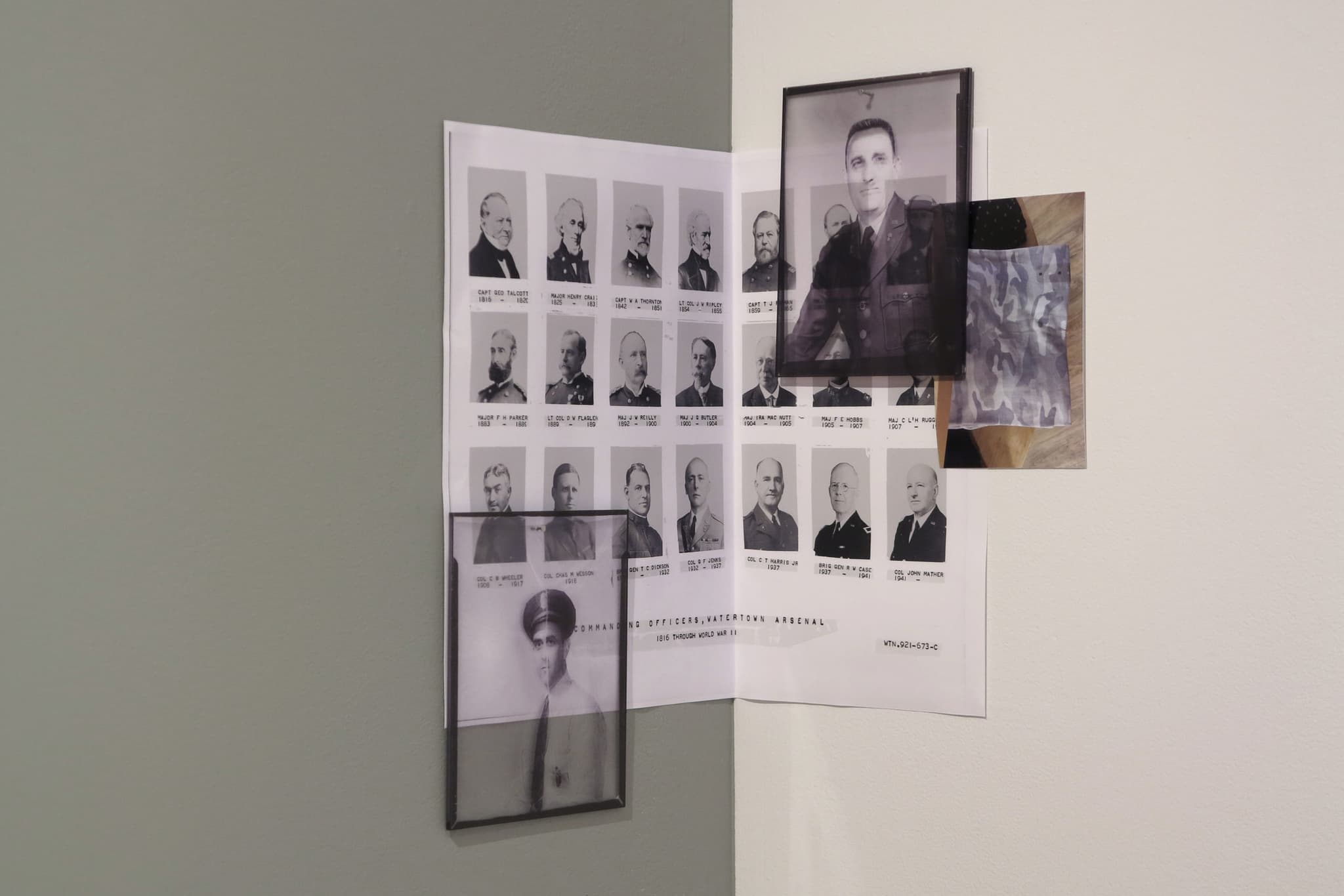 Towards the back of the gallery, the sole sage green wall draws the eye toward a salon-style configuration of eight framed photographs titled Building. The work has an erratic rhythm; like other works in the room, it is a photomontage describing the story of the Arsenal’s primary use as a weapons manufacturing site, but interspersed among the archival material are photos of clothing and mannequins taken by Zakari. The artist playfully splits images between frames—in one instance an image of men in lab coats and masks handling a large canister is split into three frames. Tucked into the corner between this salon hang and the next, a montage of military portraits titled Commanding Officers is pinned to the wall, beckoning the viewer closer. Zakari plays with the cadence of the show throughout, using scale and fragmentation as her primary tools.
