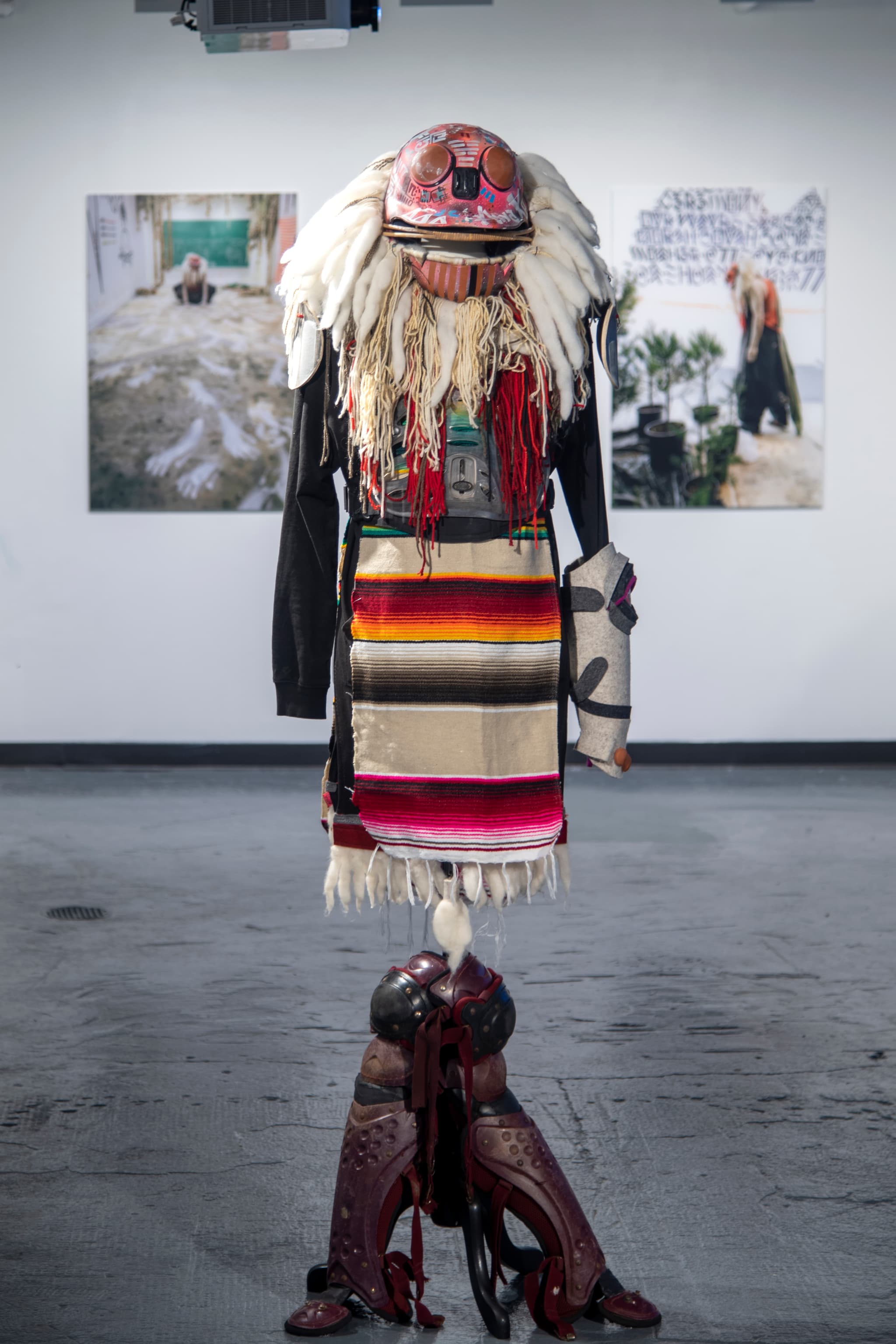 At Emerson Contemporary’s Media Art Gallery, “Future Ancestral Technologies: nágshibi” poses a critique of colonialist practices while providing hope for the future through a timeless science fiction narrative. The work of Cannupa Hanska Luger, a New Mexico-based artist who grew up on the Standing Rock reservation, creates a space that looks so far to the future, it feels like a glimpse of the past. Nágshibi, which means ‘to be after’ or ‘to go beyond’ in the Hidatsa language, provides the framework for the show, creating a context outside of linear time in which anything is possible—including the collapse of capitalism. Organized by newly appointed Foster Chair in Contemporary Art Theory and Practice and Distinguished Curator-in-Residence Dr. Leonie Bradbury, “Future Ancestral Technologies” is a whimsical reframing of our inevitable post-apocalyptic future. Dr. Bradbury describes the curating process for this show as a collaborative reflection of Luger’s intentions. Focusing on Indigenous peoples’ connection to the land and the grief that comes with its destruction, this project functions as a site for colonial resistance. While iterations of the “Future Ancestral Technologies” project have been shown previously, most recently at the Ford Foundation gallery in New York City for the show “Utopian Imagination,” this specific combination of objects, photographs, videos, lectures, and performances have never before appeared together.