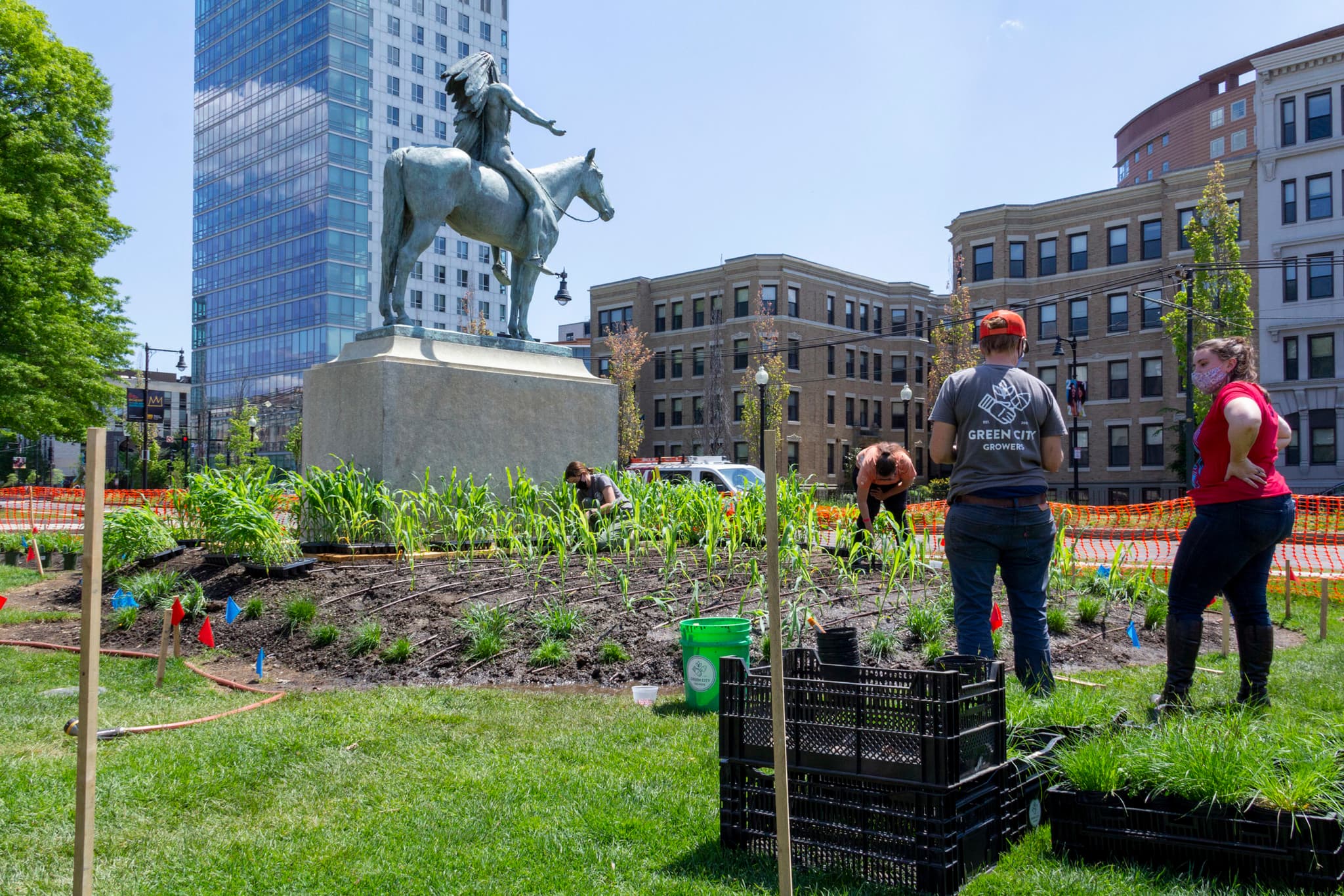 Elizabeth James-Perry and her team planted a Three Sisters garden around Cyrus Dallin’s Appeal to the Great Spirit for Raven Reshapes Boston: A Native Corn Garden. Photo ©  Museum of Fine Arts, Boston.