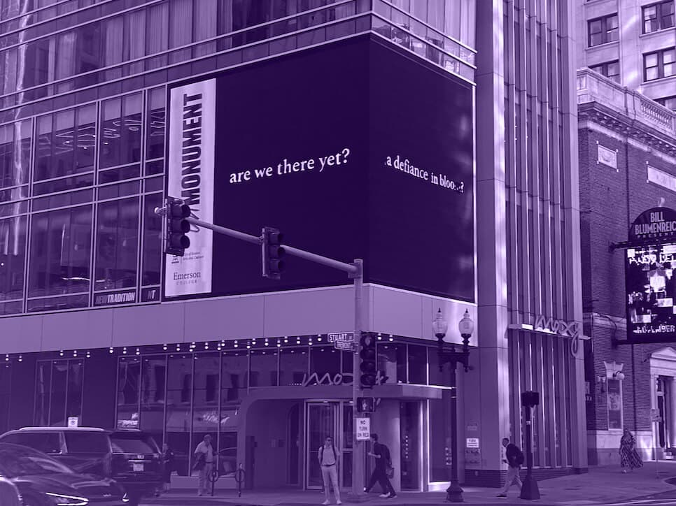 A large digital advertising screen sits in the hip of a Downtown Boston hotel in the theater district, wrapping around its sharp right-angled corner at the intersection of Stuart and Tremont streets. Just above the hotel’s entrance and pink LED name sign, colorful ads rotate on the sleek screen embedded in the hotel’s glass exterior. Positioned on a corner a block away from Boston Common and Emerson College, the ads are big and bright enough to make them out from three blocks away. The visual noise is familiar. We are used to being sold something. But through an intervention by artist Kameelah Janan Rasheed, we are now confronted—just for a moment—by a new screen. An entirely black one materializes within the ad roll with lowercase white letters radiating across the middle: “are we there yet?”