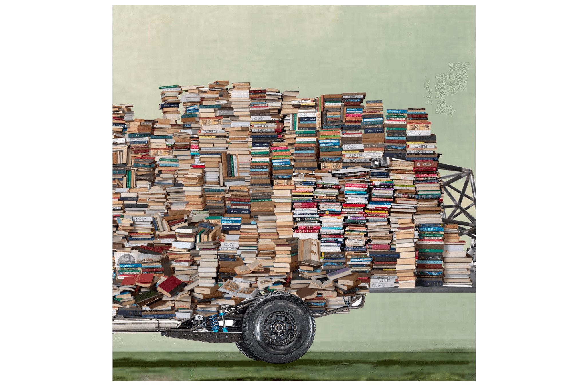 EM: This 72-by-48-inch graphite drawing depicts a fully fledged old-growth tree in British Columbia. Surrounding it are references from historical landscape painting, imagery from photography I’ve taken, plus plenty of invented components. The focal point is a massive tree surrounded by cut woodland, and there’s a character in a boat, suspended from the tree. There are questions about purpose and intent: maybe this person is the forester or the arborist, perhaps they’re helping the tree, or maybe they’re the one that will cut it down. I try to set up narrative cliffs where we don’t know what the character’s purpose might be, and I’m hoping that builds tension in the work. We humans, out of naivete or ignorance, often corrupt things, but we’re also capable of being wonderful, thoughtful, protective, and collaborative. I don’t always know what these characters will do, but I love fiction, I love stories, and I love finding ways to build an environment where viewers might craft their own tales from what I’ve started.
