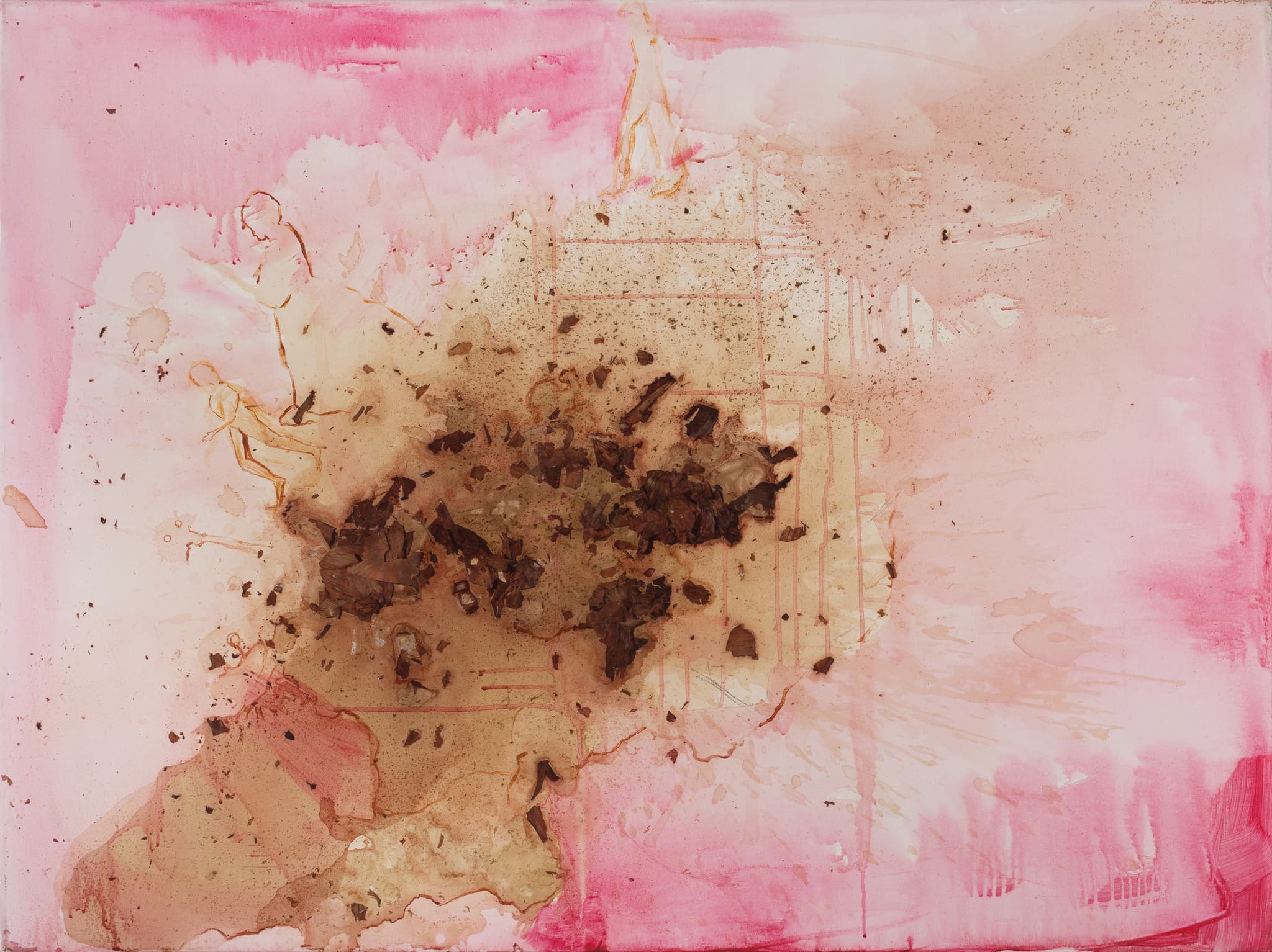 MNO: Well, when it’s all dry, I lift the canvas or paper up. And some of the onion skins fall off, some of them don’t, and so I work with that. It is very much a conversation. The work is in control of me as much as I am in control of it. And so I look at the onion skin stains and the markings left behind, and then I start to imagine. Either events from history or something I heard on the news or almost anything, although they revolve around certain themes, such as displacement, genocide, creativity.