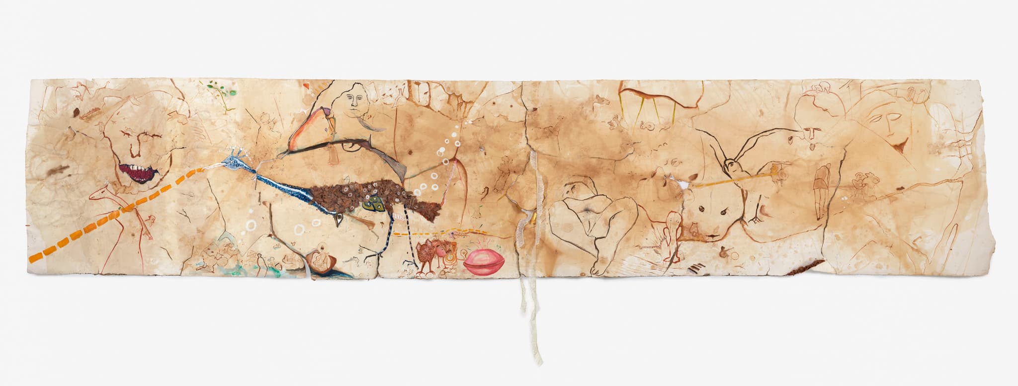 Marsha Nouritza Odabashian, 21’ Drawing, 2019. Onionskins, Onionskin dye, Graphite, Colored Pencils, Conte Crayon, Acrylic Found Paper, Lace on Arches Watercolor Paper, Approximately 67”x 252” (45”x 252” without lace). Image courtesy of the artist.