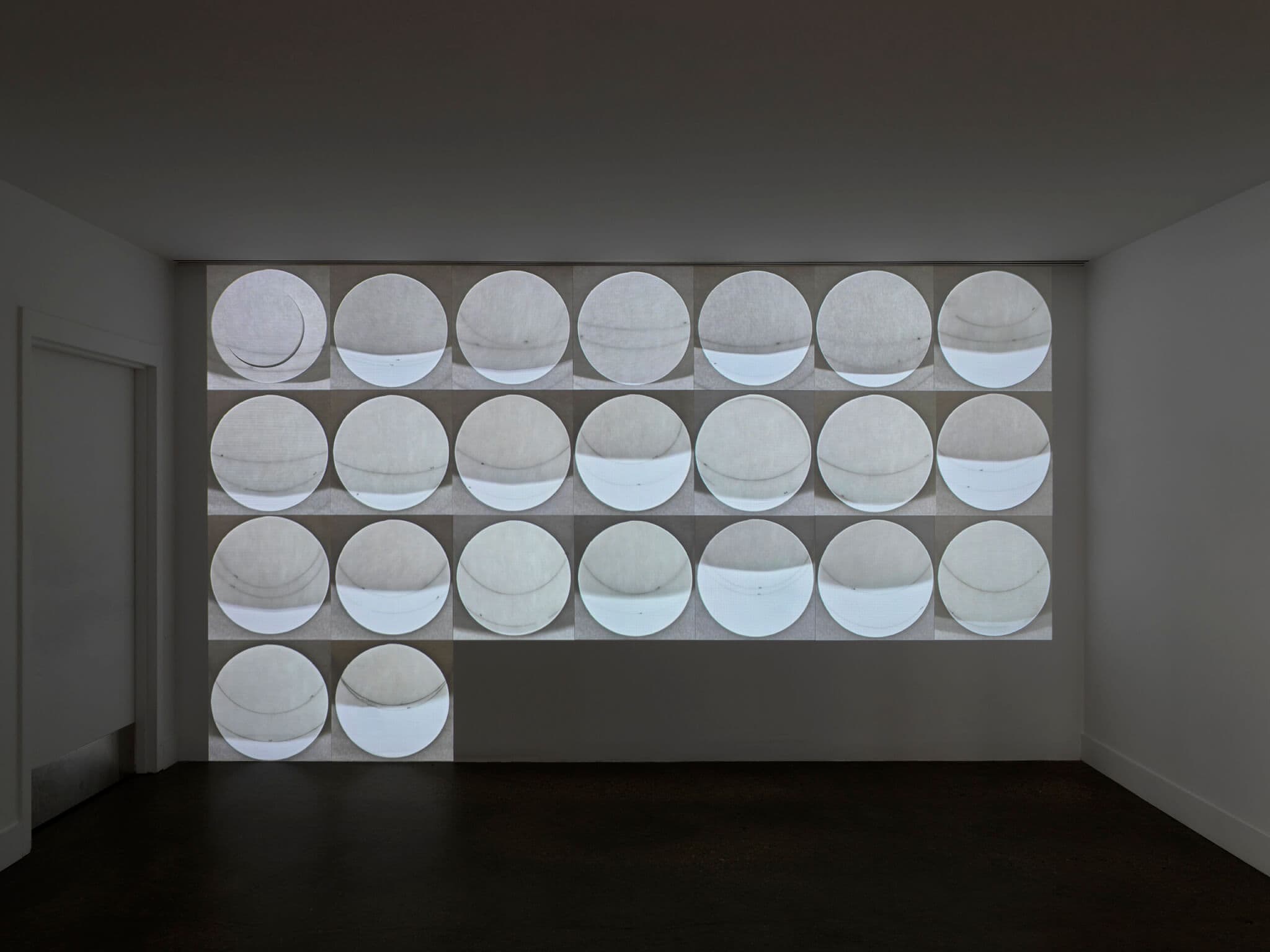 Great Year (2025), located in the entry gallery, is a projected grid of twenty-three circles using cut-out animation to track the sun’s and moon’s orbital movements over the exhibition’s twenty-three-week duration. A small wooden disc affixed to the wall is moved each week by a gallery assistant who will change the display to reflect the current position of the sun and moon in the sky overhead—this is just one of many tasks the gallery’s staff are expected to complete as Orchestrators in the exhibition. The work prompts viewers to become acutely aware of their precise location—Cambridge, MA, Earth—while also drawing attention to the continuous passage of time through our shifting relationship to the universe above, specifically invoking the zenith in astronomy: the point directly overhead that anchors our orientation to the celestial sphere.