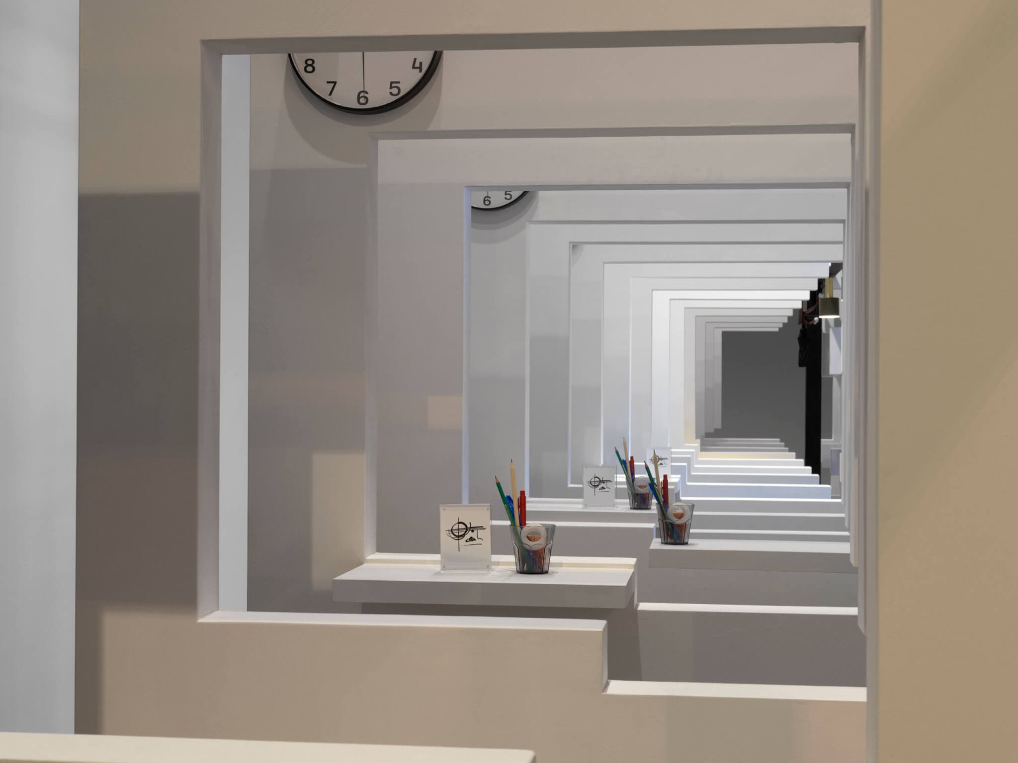 Orchestrators slowly move a metal frame with various objects and furniture through each section, causing the rooms to visually overlap and pass by. The experience is something akin to riding an elevated train and watching the buildings slide by, little slices and slivers of other people’s lives both familiar and distant from our own. The fact that this is human orchestrated rather than mechanical matters. Orchestrators, mostly unseen due to the fragmented space, repeat the action often. Their rhythms vary and their timing is irregular, bringing an essential human presence into the work. Details in the “rooms” include an iPhone with fragments of Annie Dillard’s 1982 essay “Total Eclipse” scrolling across the screen; a TV plays starlings in their swooping, circling communal flight; a laptop navigates a geological map of a site at the Sahara and plays fragments of Olivier Messiaen’s “Quartet for the End of Time.” Subtle but present, the twelve ceiling lights in the gallery shift as they simulate the sun’s arc from dawn to dusk. Virgo’s austere white space and repeating wall clocks as well as the vastness of the gallery contemplates the loneliness and isolation of modern life through the empty domestic space, the passing nature of our movement in urban environments, and the interconnectedness we can all experience through nature, technology, literature, music, and sight.