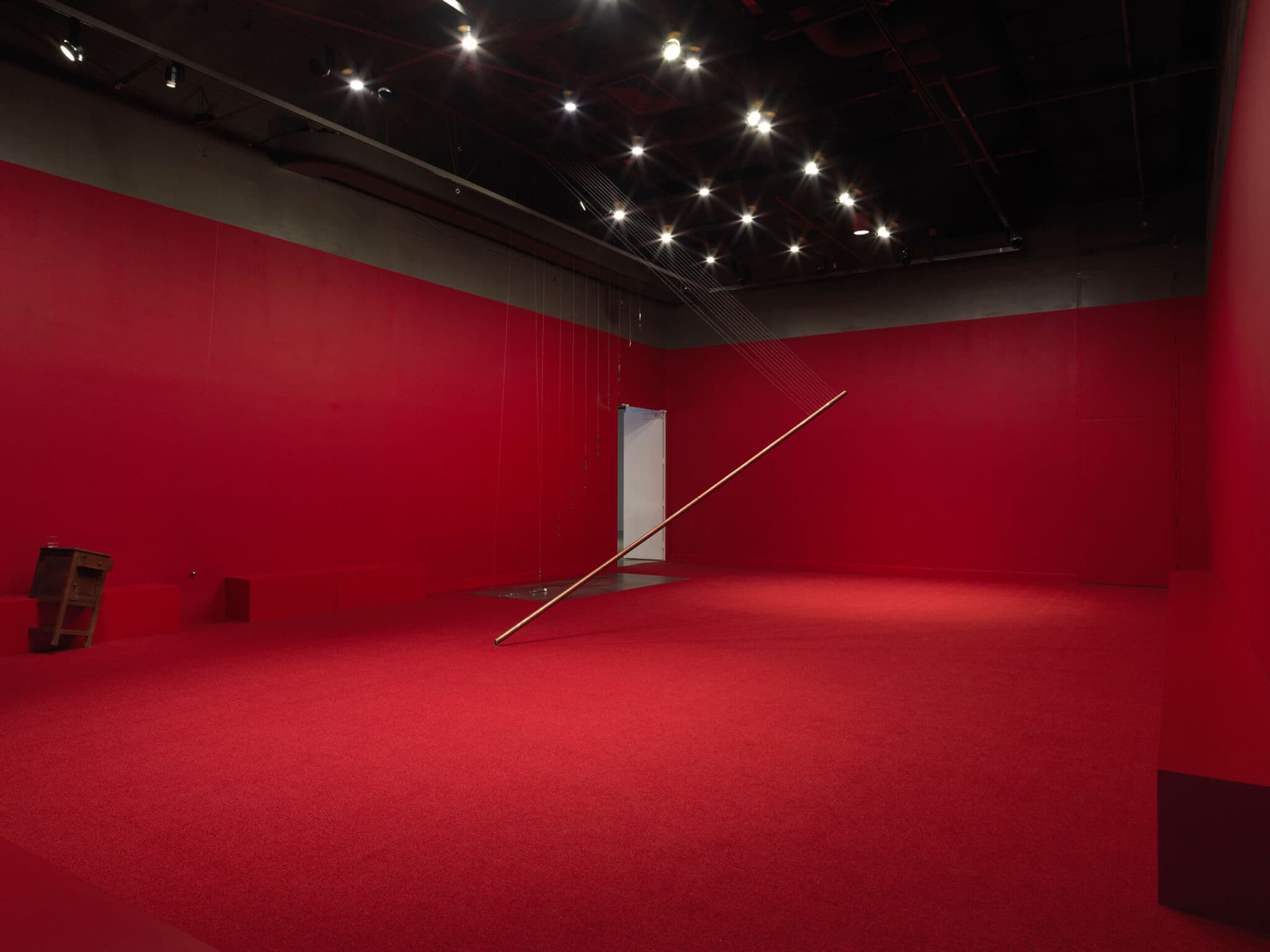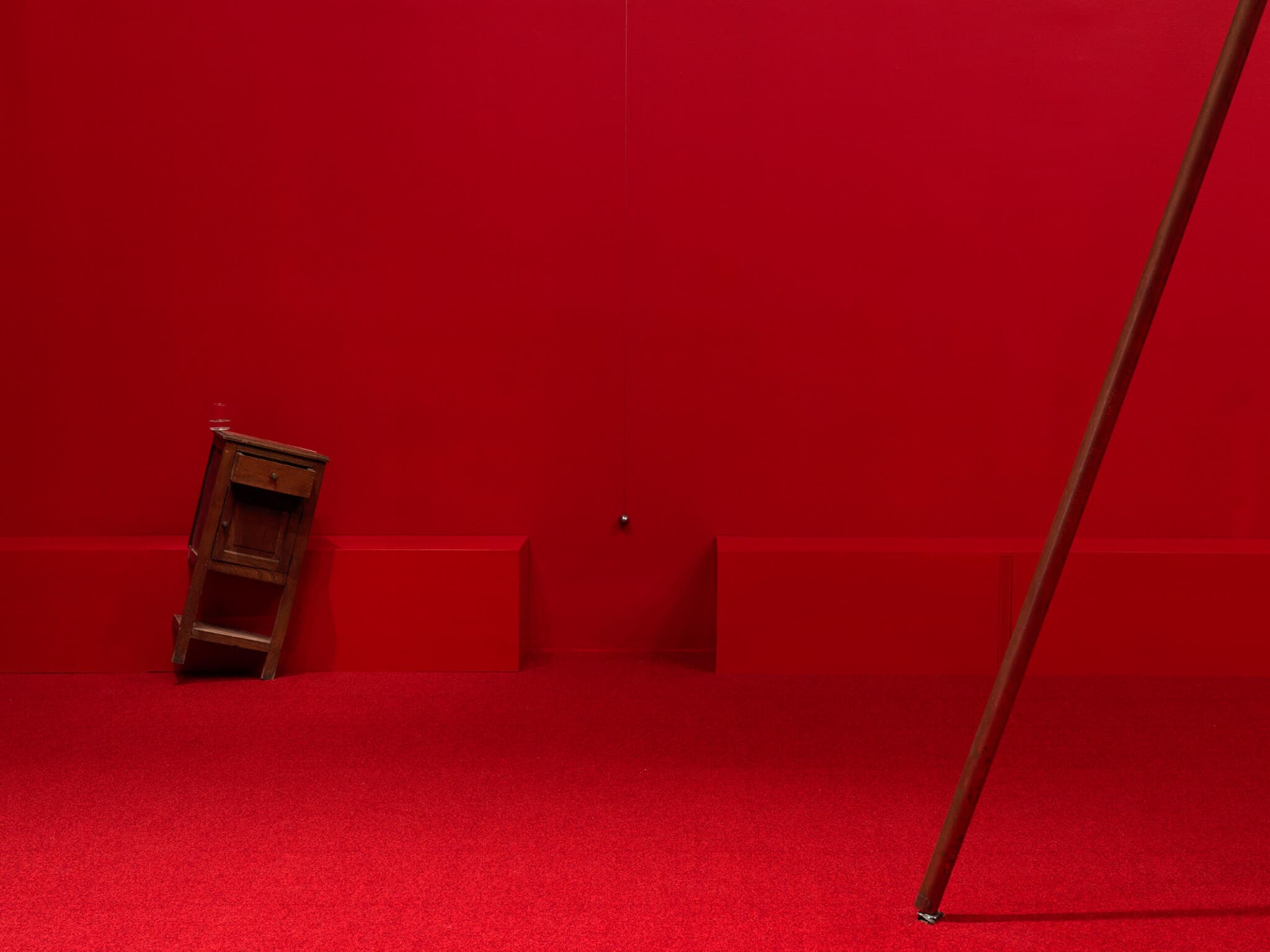 The gallery to the right is an entirely red room: red carpet, red fabric–wrapped benches, red walls—perhaps a little Lynchian in tone—holding individual works. Multiple elements of orchestrated movement and sound fill the room. One such work is The Ask (2025), which consists of three pendulums hitting against the wall in a slow and steady rhythm reminiscent of a clock ticking or a heart beating. The Orchestrators intermittently pause and restart the work, interrupting the repetition with moments of silence. The gentleness of the sound and delicate touch of the pendulum to the wall recalls for me the long running sentences of Proust’s epic novel In Search of Lost Time (1913). Gómez-Egaña, like Proust, is not in a rush to communicate his content and reflections on time. They seem to be kindred in Proust’s message: “Do not wait for life. Do not long for it. Be aware, always and at every moment, that the miracle is in the here and now.”