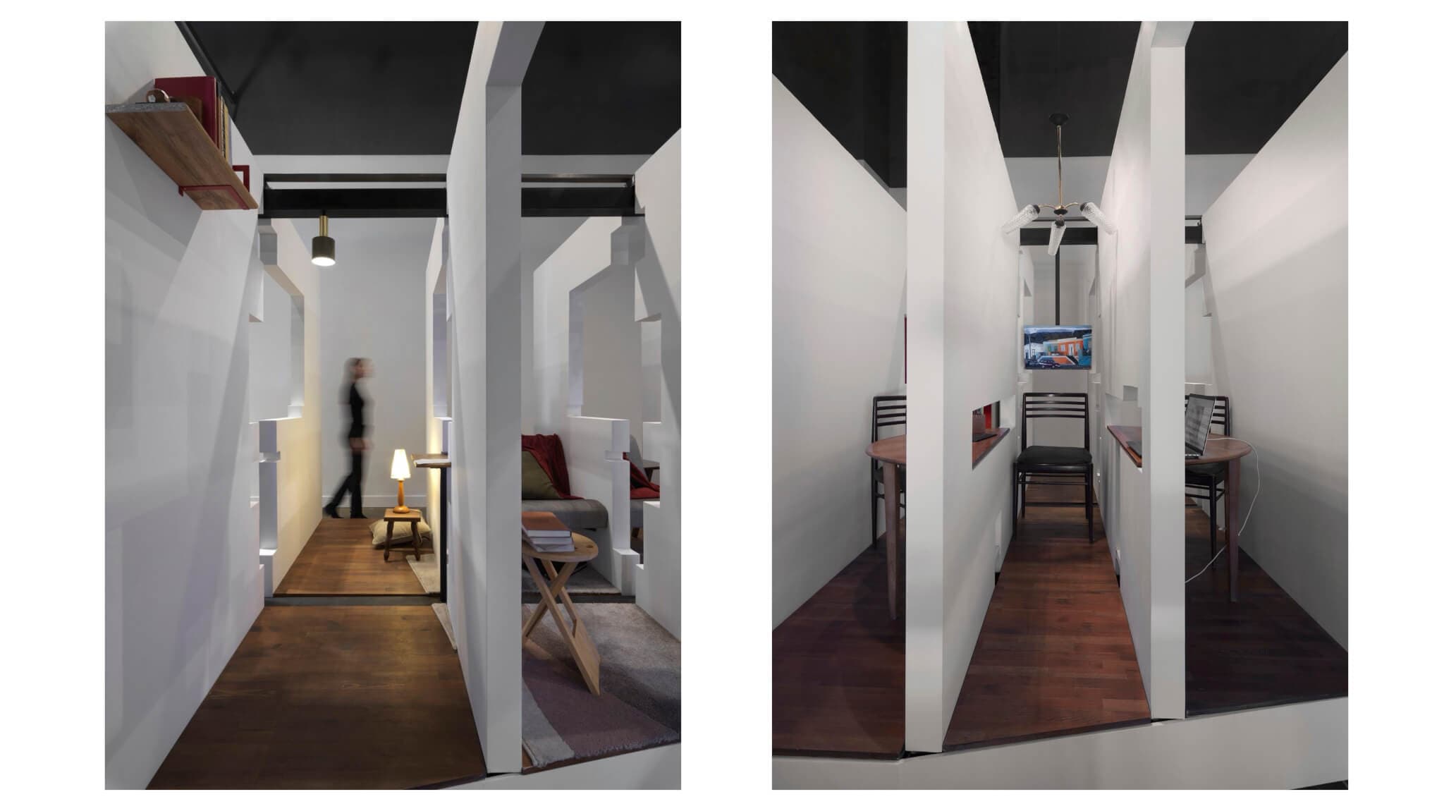 An artwork consisting of partitioned walls that creates a fragmented apartment.