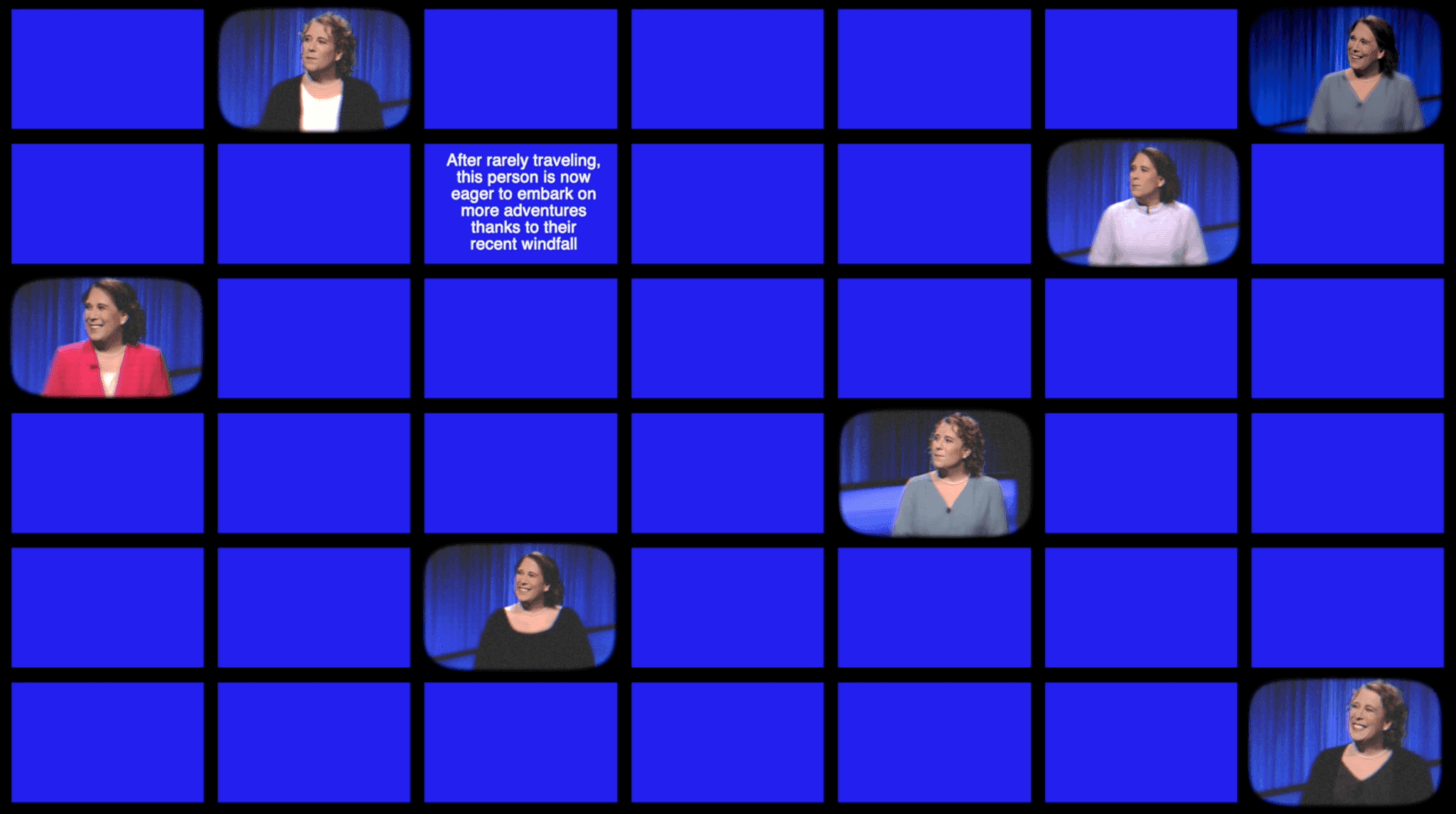 The cumulative effect of this mode of presentation is a piecemeal portrait of Schneider that, despite highlighting the peculiarity of this exchange, presents a compelling portrait of the contestant. Even for avid Jeopardy! viewers, this logical yet uncanny presentation of this segment calls into question the ways in which we present ourselves to the world. At the end, when the work asks the audience, “Who is Amy Schneider?” the viewer gains an understanding of who the contestant is—or at least, what she finds important to convey about herself.