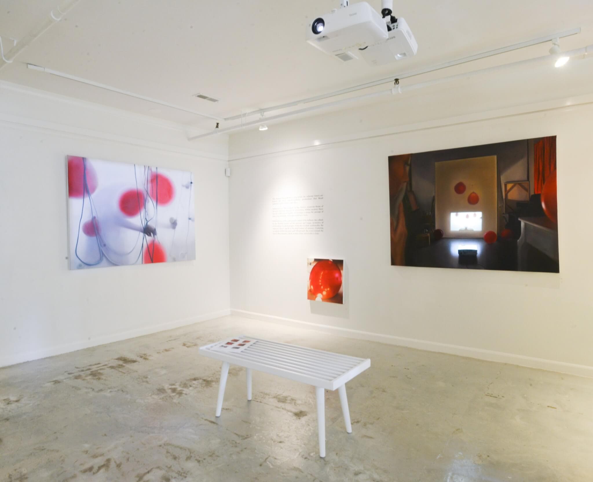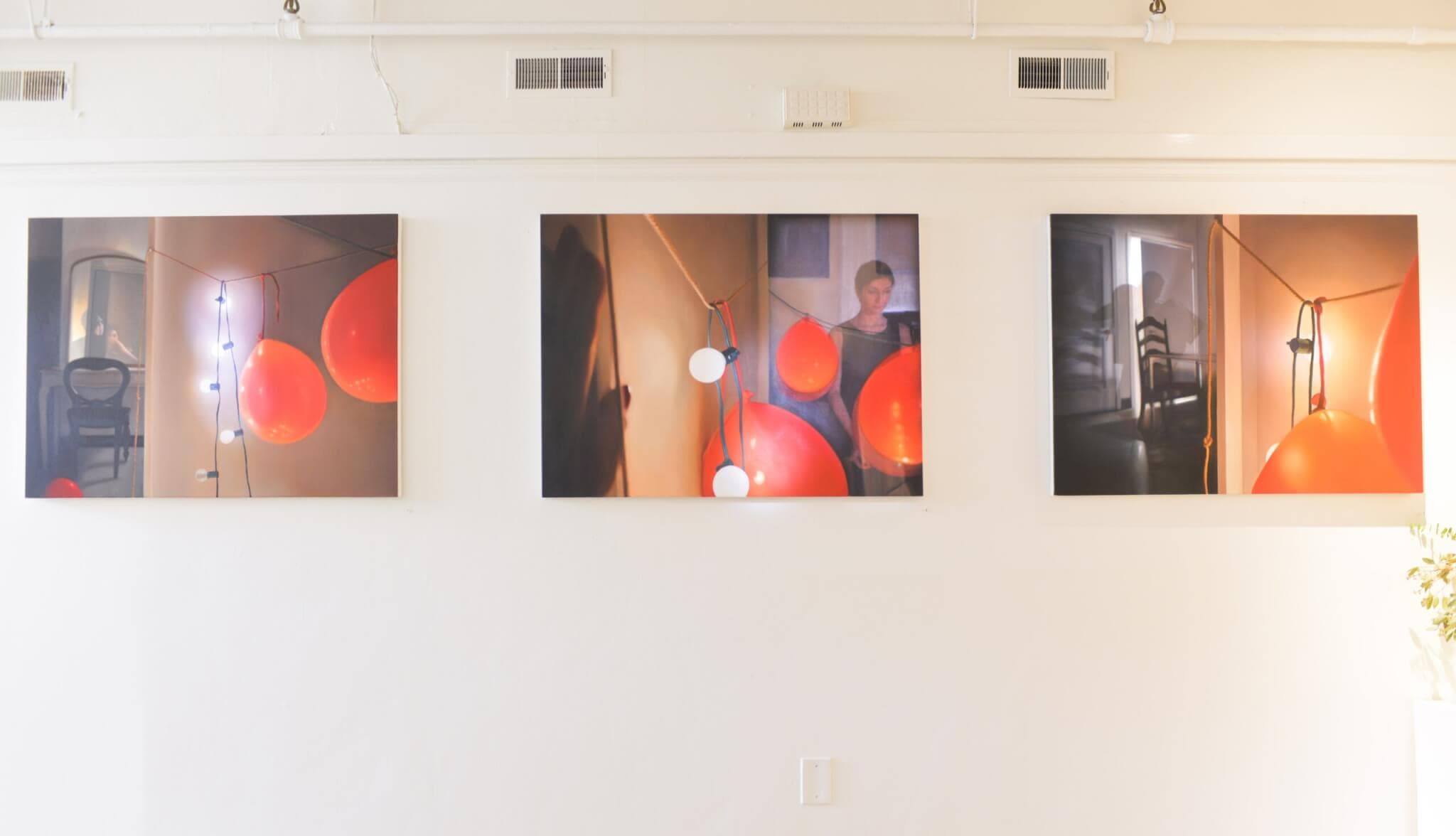 Against shadowy backgrounds, the vibrant motifs of bright red balloons and glowing string lights stand apart. Video clips of varying lengths move across the canvas via carefully installed and mapped projections. A woman meticulously blows up balloons or sets up the lights, while in others, the silhouettes of frolicking figures or raining confetti provide a tentative sense of levity. A dissonance exists between the objects of celebration and the solemn, solitary figures. The viewer sees the evidence of cheer, but never actually glimpses true lively celebration—only the quiet moments in between. The result is a feeling of unease and a whisper of melancholy. Something is not quite right, though what exactly it is remains elusive.