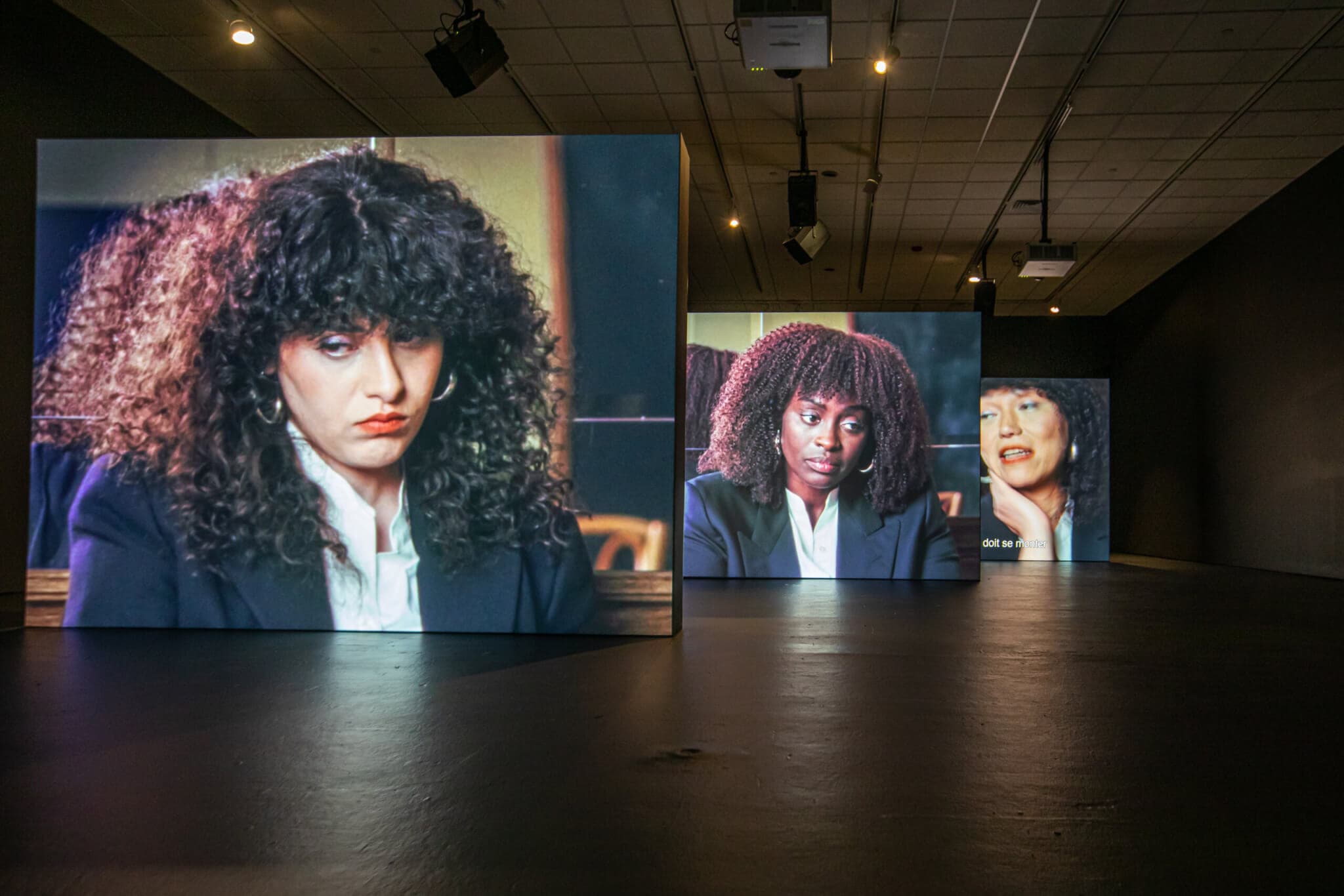 Our mixer insisted that we reproduce the space in Paris in order to do the installation mix. We did it in a large recording studio [rather than a film edit suite] to make sure it was sonically perfect. We had three large flat-screen monitors to simulate the spatial relations of the installation—and we would move through the space physically to adjust the mix. Once we were in that space, we realized that we needed more speakers—not just designated to each actress but also facing the opposite way, so that when you’re looking at Aïssa listening, Manal feels right there at the spatial angle that she would actually be.