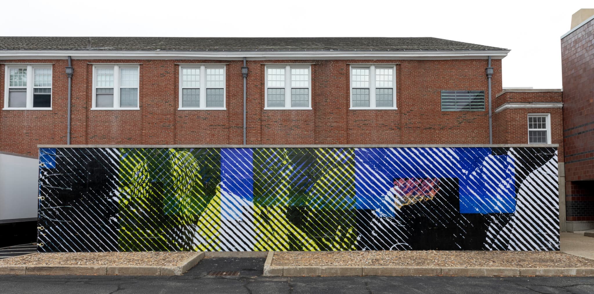 Along with her own musical stylings, Jackson’s retrospective emphasizes that music is embedded in her practice, as many of her works, as well as the exhibition itself, are named after songs she loves. The Doobie Brothers’ 1978 album Minute By Minute provides the title for Jackson’s public outdoor mural at Tufts. The piece combines the last photographs shot by her late mother—tree studies made during the COVID-19 pandemic—with images that Jackson took of folks rejoicing in big gatherings post-lockdown. These symbols of isolation and reunion are printed in halftone and crosshatched together to collapse time.