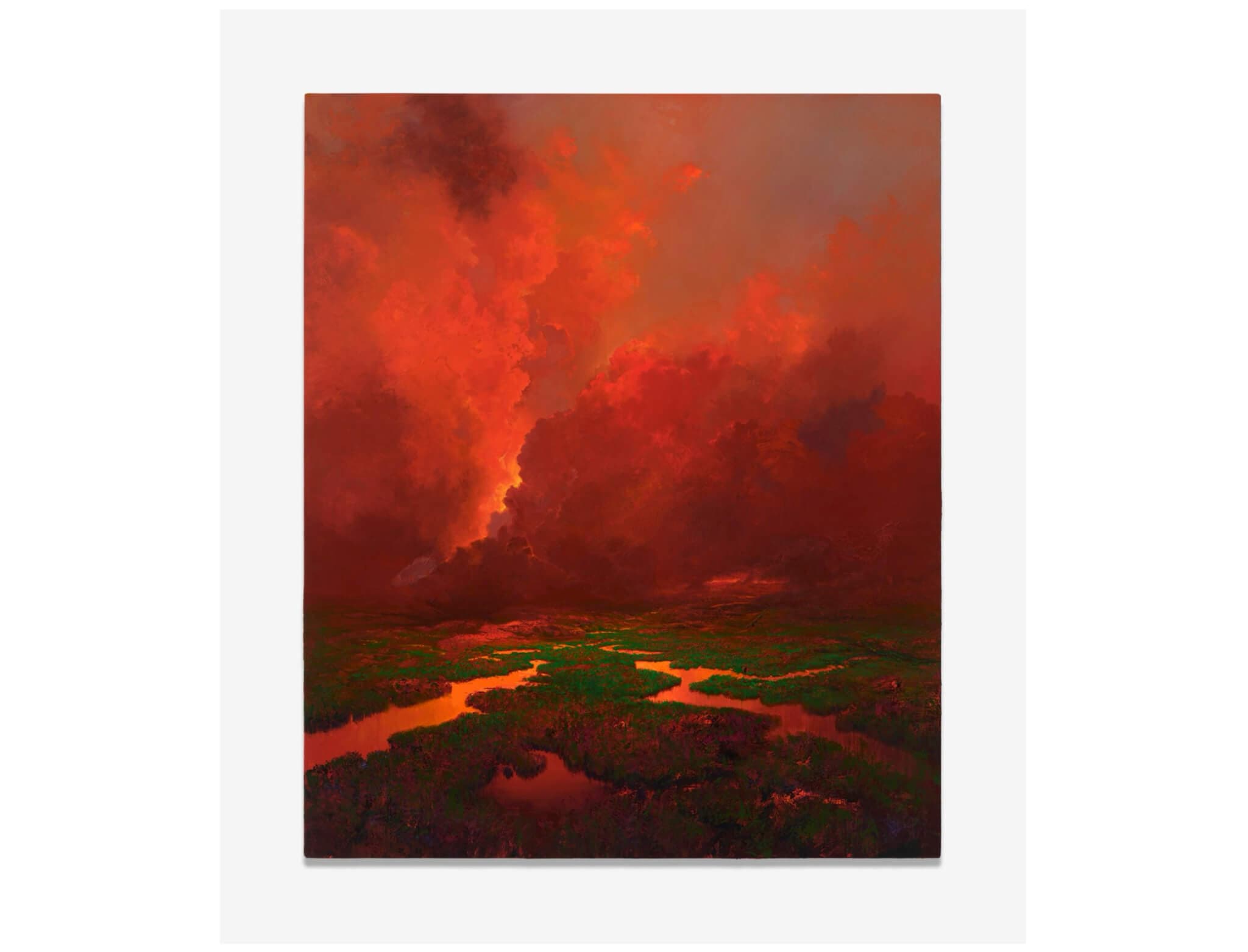 Wilhelm Neusser: You’re totally right that the orange marshes, especially through the kind of meandering canals going to the distance, lure us in towards the horizon line. But at the same time, through this kind of smoky wildfire atmosphere, we get sucked into the area where the heat and the danger is the most extreme, a hard-to-define, somewhat scary and anxiety-inducing environment. And the horizon line actually doesn’t really exist. It’s kind of disappearing into orange or brown hues.
